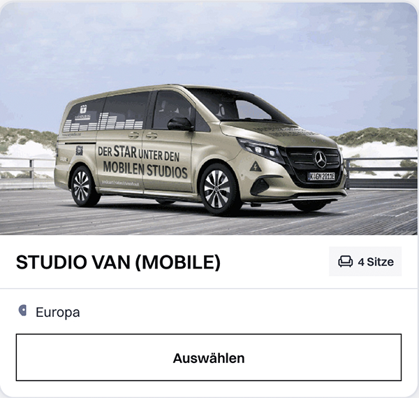 Das Studio kann indoor oder outdoor sowie auf Events, Tagungen, Messen oder zu Promotion genutzt werden und sorgt sowohl technisch als auch optisch für viel Aufmerksamkeit. Mit dem VAN kannst Du Dich noch entspannter auf die Inhalte und das Gespräch konzentrieren. Den Rest übernehmen gerne wir. Außerdem bieten wir Dir attraktive Rabatte für Serienproduktionen an. Probiere es doch einfach mal aus!